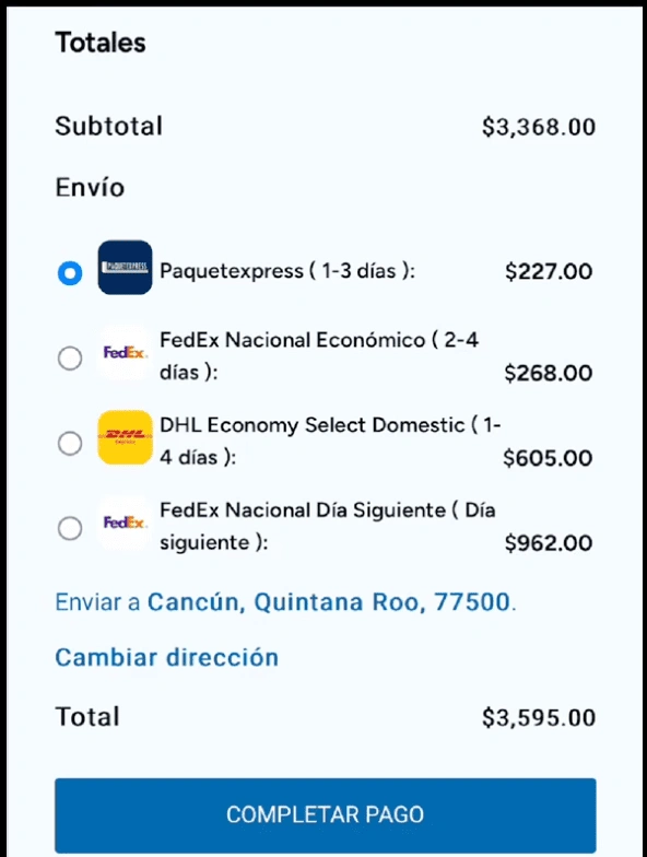 4.- Introduce tu código postal para cotizar el envío. Elige la opción que más te convenga y selecciona “completar pago”.