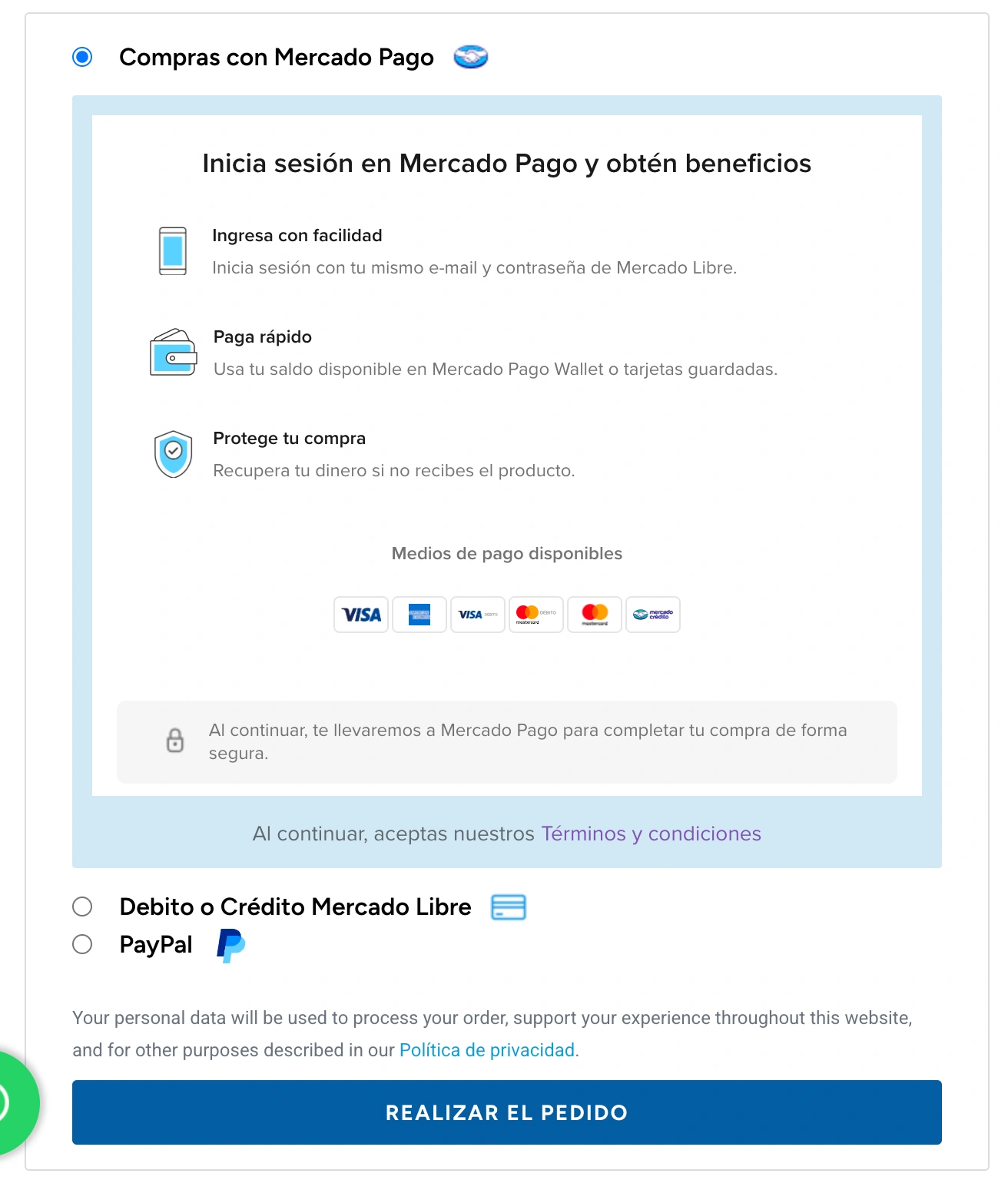 6.-Elegir el método de pago que más te convenga, Todos nuestros métodos están respaldados por Mercado Pago y Pay Pal.